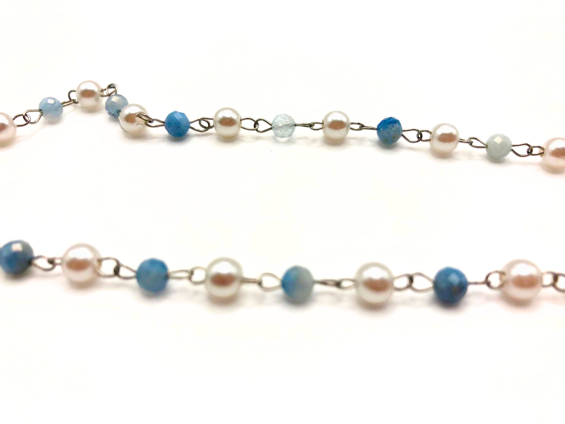 inspired by mermaids and the sea, this necklace is handmade using 4mm aquamarine gemstone beads and 5mm imitation pearl beads.
