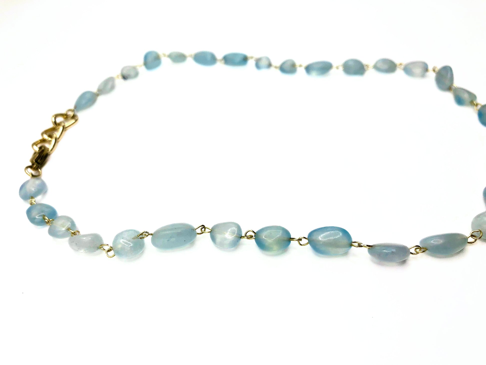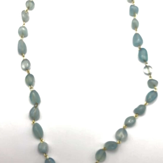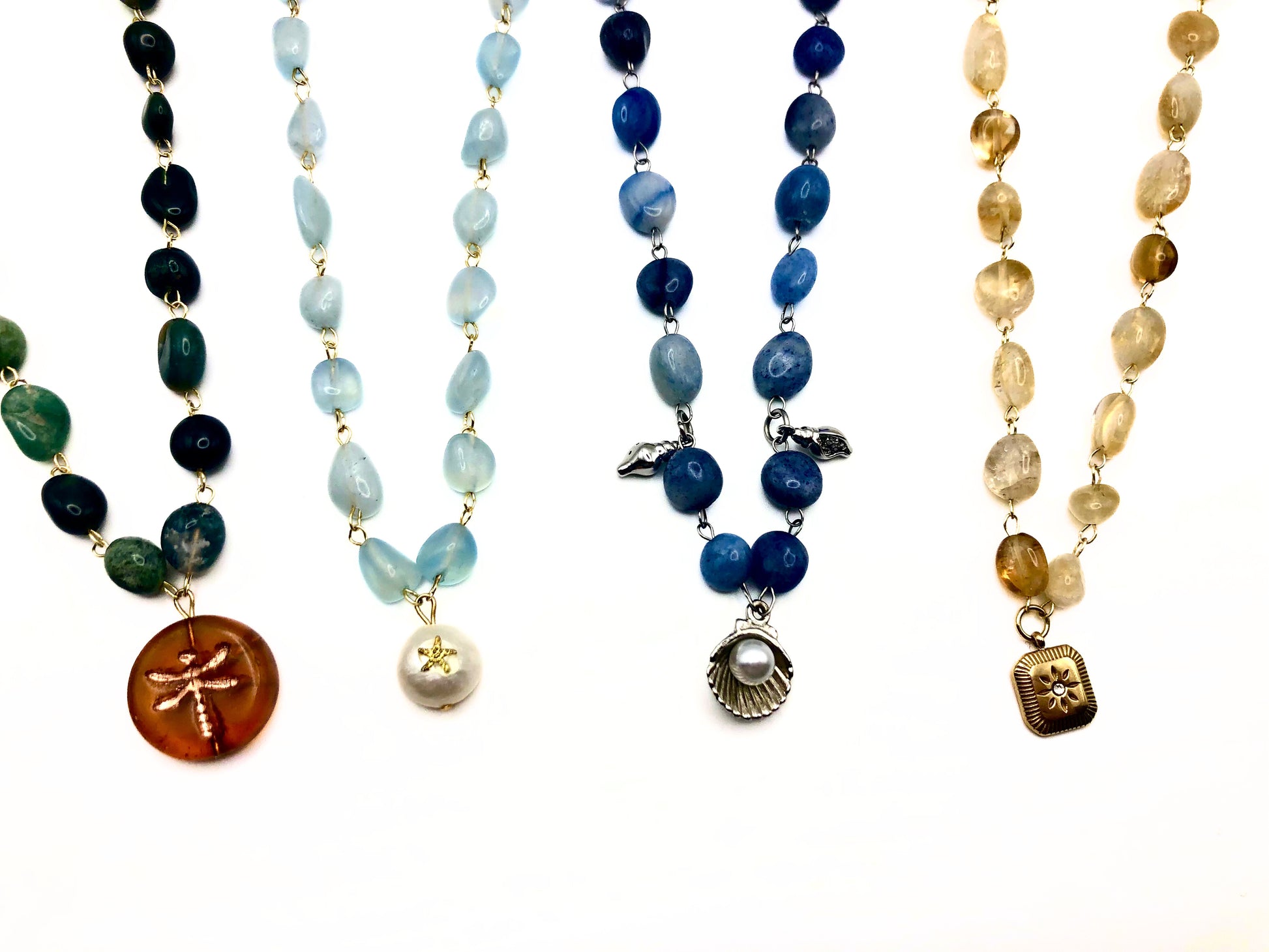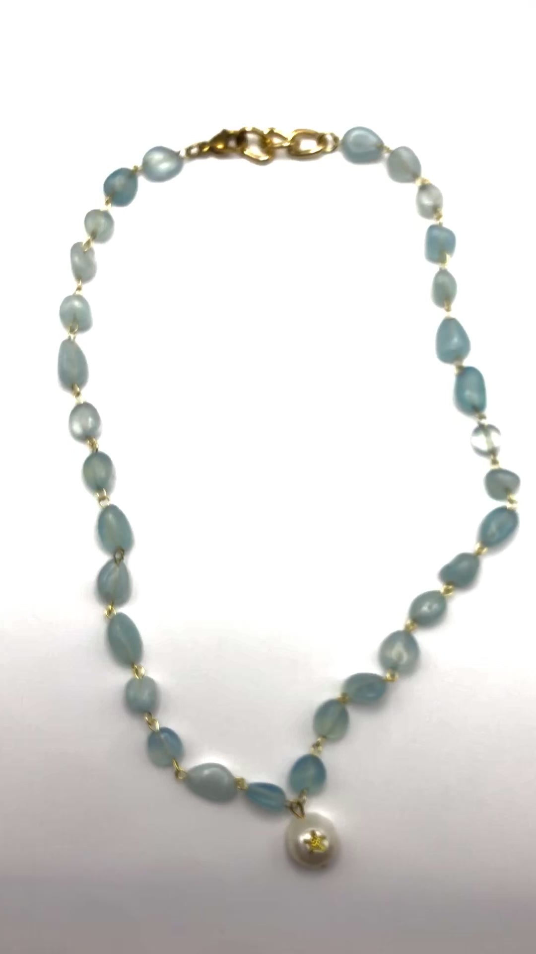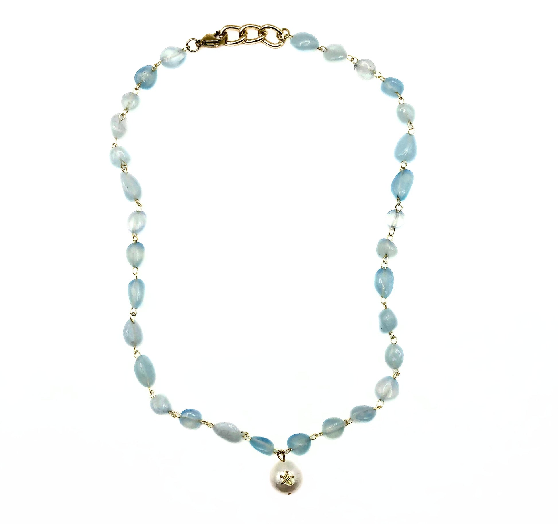drops of the ocean to wear around your neck, these aquamarine gemstones are reminiscent of the serene sea and its calming waves. Complete with a golden starfish that tops a round shell pendant, this necklace is perfect for those summer walks in the sand.