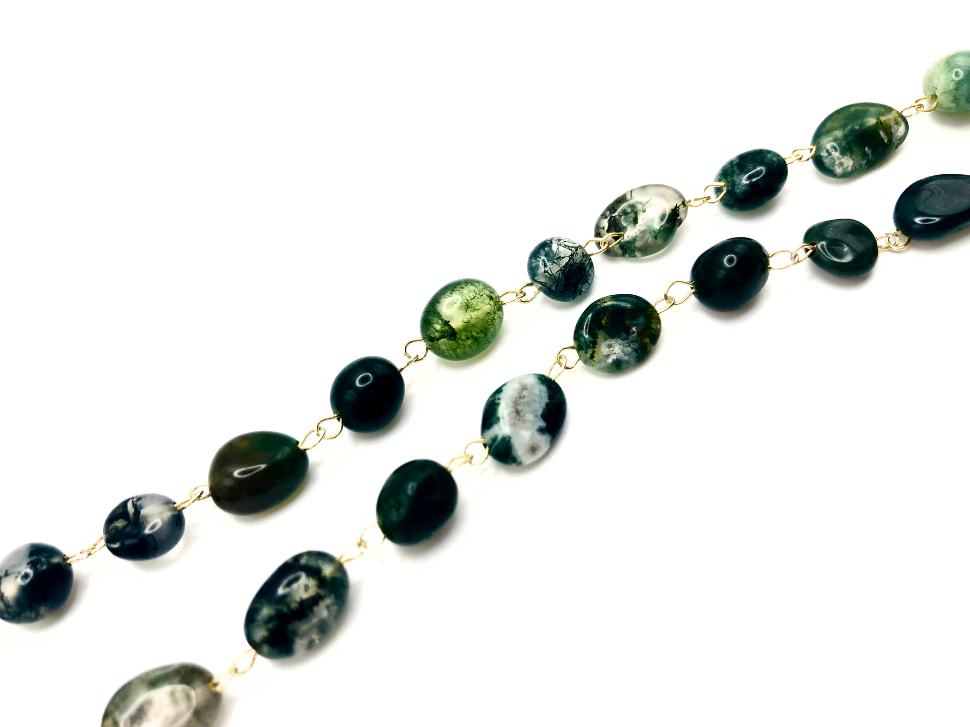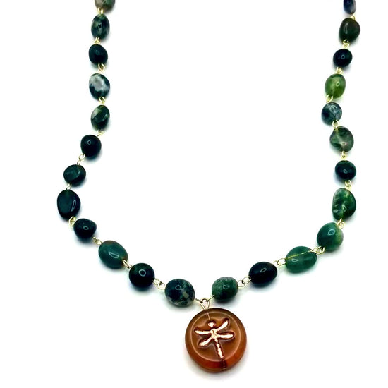 created using moss agate gemstones, and paired with a beautiful bronze-coloured round dragonfly glass bead styled as a pendant.