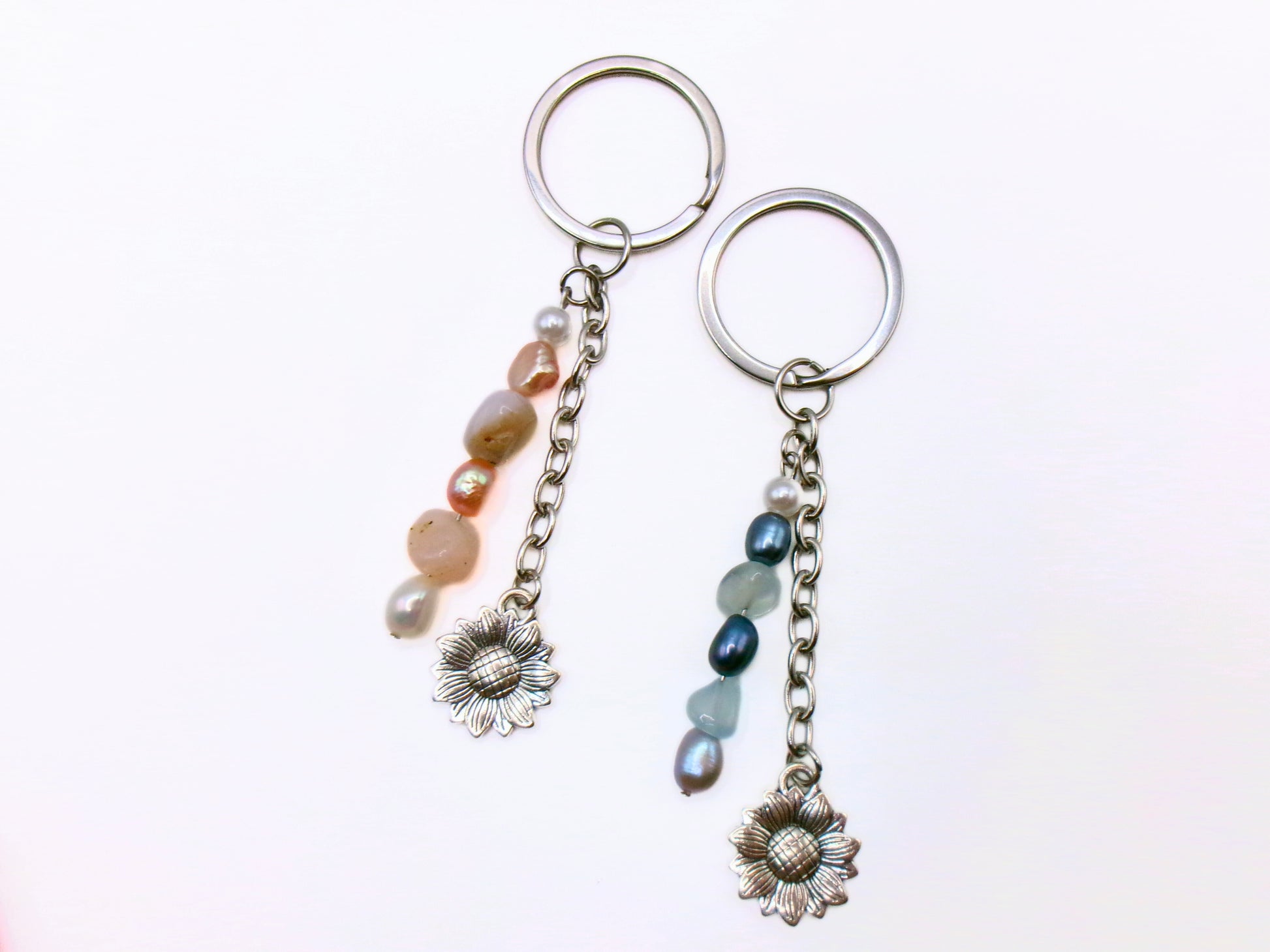 handmade stainless steel keychain with a sunflower pendant, designed to be an elegant lightweight option for anyone wanting to add a touch of femininity to their keys, bags etc.