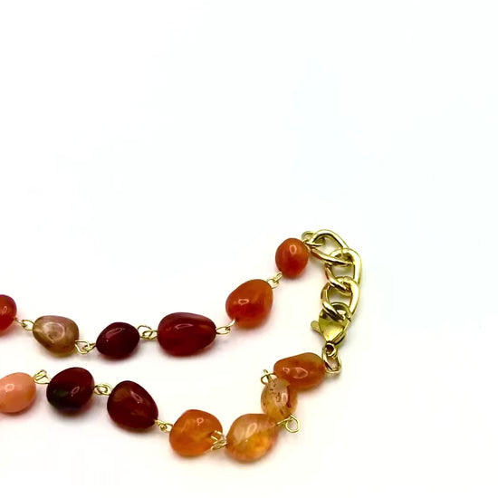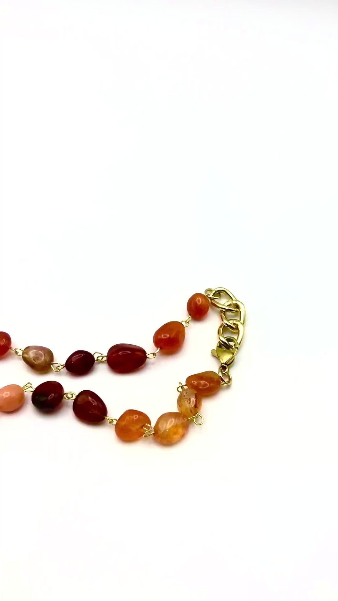 doused in fire and kissed by the sun, the sunstorm necklace elegantly captures the warmth and chaos of romance. the carnelian gemstones, between 5mm and 9mm in length, compliment the golden tones of the pendant and wiring.